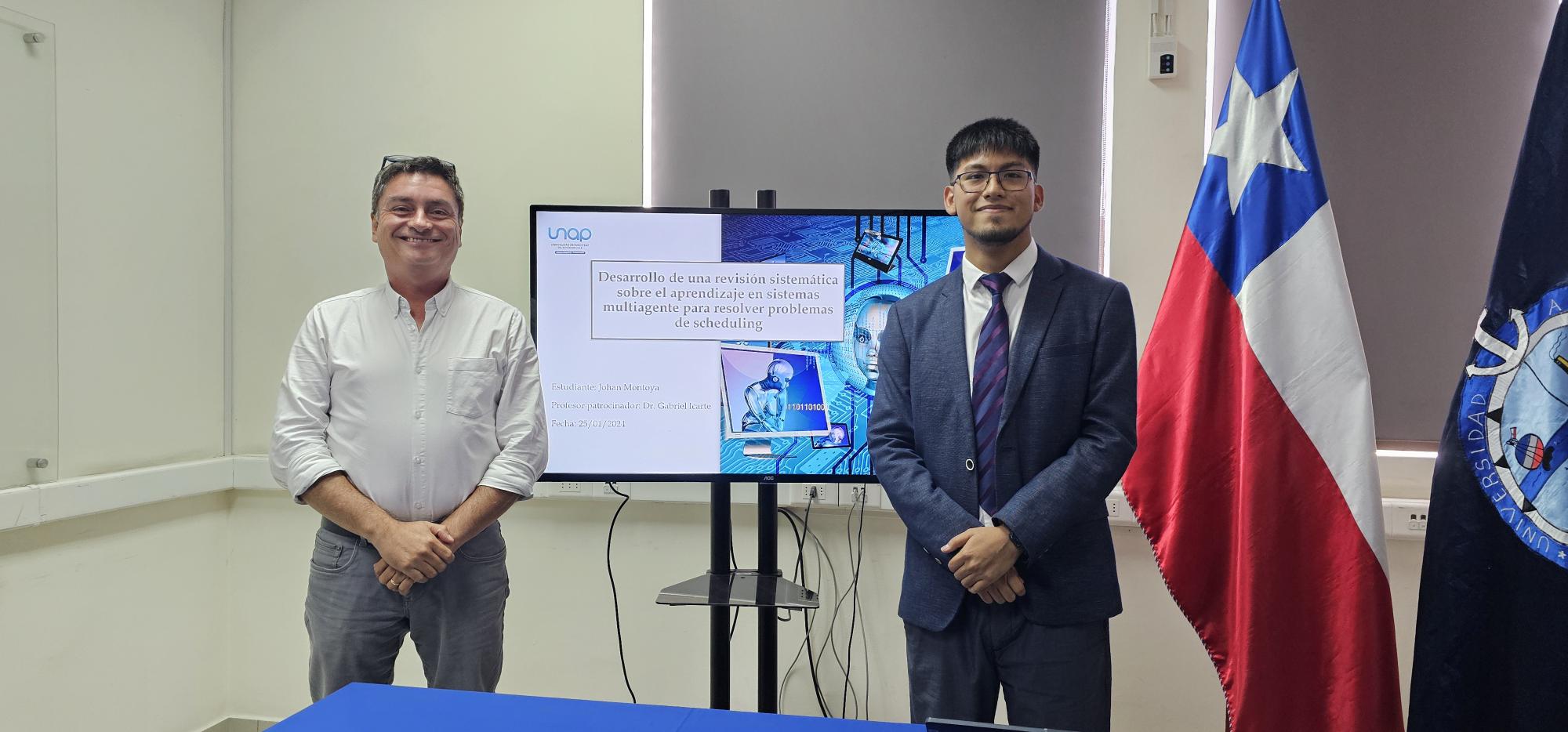El estudiante de Ingeniería Civil en Computación e Informática Johan Montoya presentó su trabajo de título, guiado por el Dr. Gabriel Icarte Ahumada, donde desarrolló una revisión sistemática sobre técnicas de aprendizaje en sistemas multi‑agente aplicadas a la resolución de problemas de scheduling, resaltando su aporte para optimizar la asignación de tareas en escenarios complejos.